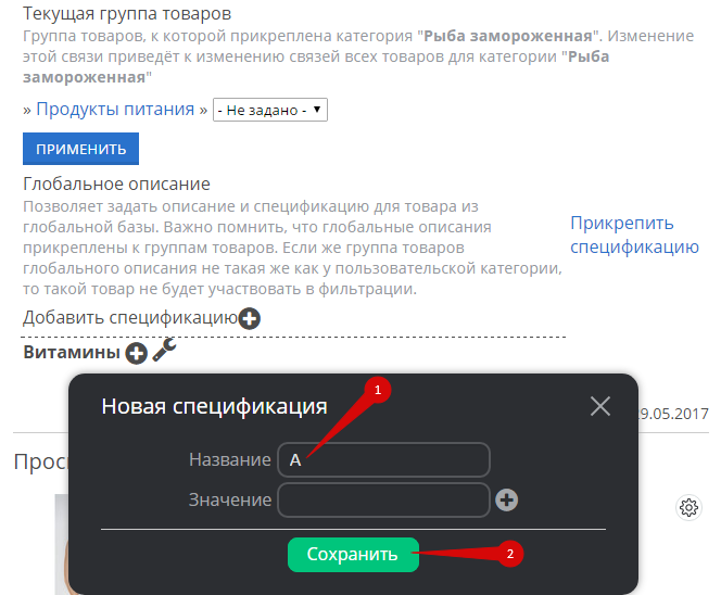 Спецификации — это перечень характеристик товаров, которые задаются владельцем магазина. Спецификации объединяются в группы, это позволяет применять несколько спецификаций к одному товару, а также иметь единое представление характеристик для товаров из одинаковых групп.