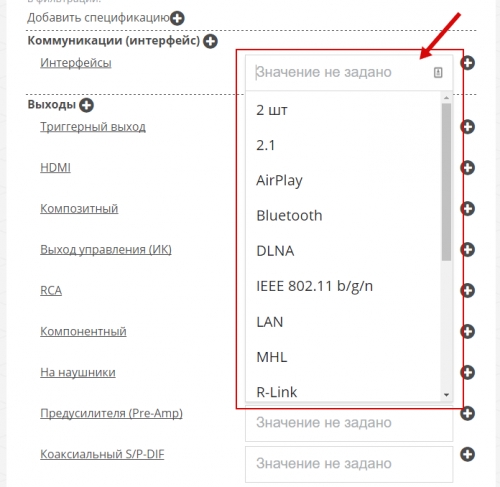 Чтобы заполнить спецификации, выберите свойства и их значения. Пример: спецификация Коммуникации (интерфейс), свойство Интерфейсы: