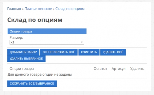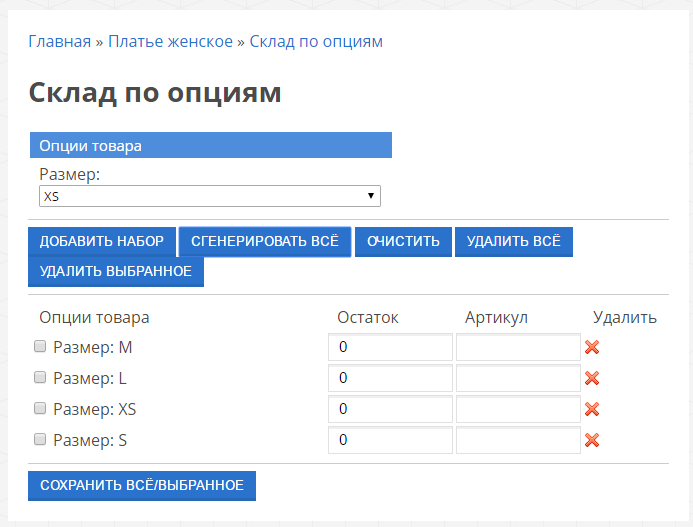 Для каждого набора опций нужно сгенерировать отдельную позицию, чтобы после задавать для нее остаток. Чтобы сгенерировать все возможные комбинации опций, нажмите на кнопку “Сгенерировать все”. После этого появится таблица, где можно указать остаток и артикул комбинации опций:
