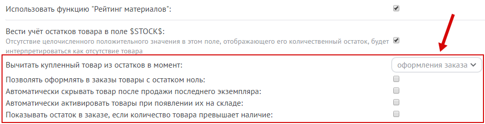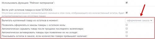 Учет остатков по умолчанию отключен. Чтобы включить его, нужно перейти в панель управления: Интернет-магазин / Настройки модуля. Найдите строку “Вести учёт остатков товара в поле $STOCK$” и поставьте в ней галочку: