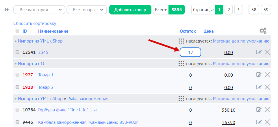 - через панель управления товарами — включите отображение колонки “Остаток”, затем нажмите на ячейку с остатком, введите число и нажмите Enter