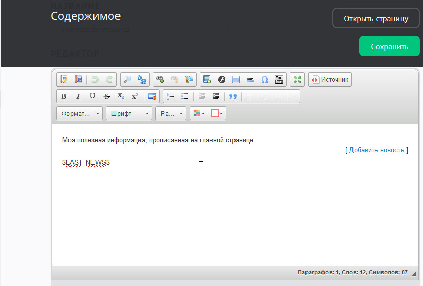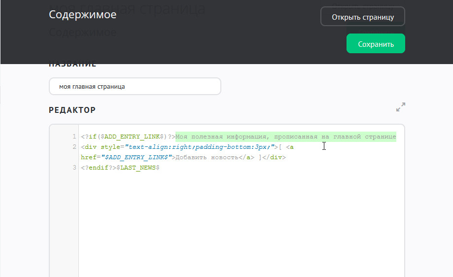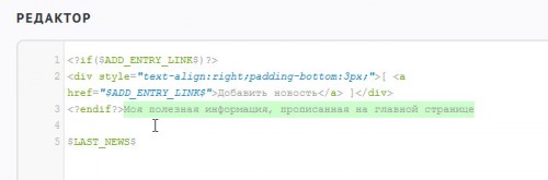 Но если вам нужен вывод новостей под текстом и ссылка на добавление новых материалов, в HTML-режиме
