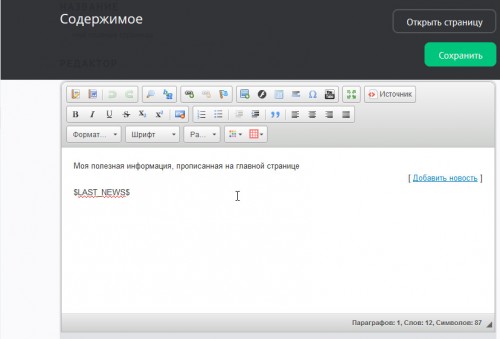 разместите свой текст после кода <?endif?> и перед кодом информера вывода новостей $LAST_NEWS$ и сохраните страницу.