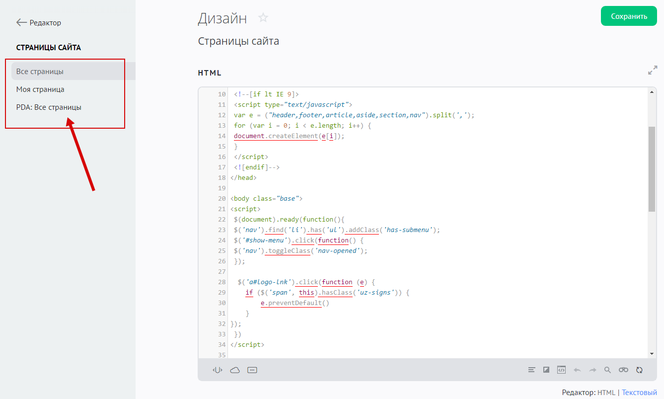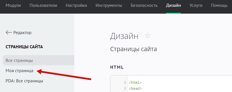 Чтобы начать редактирование шаблонов модуля, в панели управления сайтом перейдите в «Дизайн» / «Редактор» / «Страницы сайта». Затем в меню слева выберите подходящий шаблон: