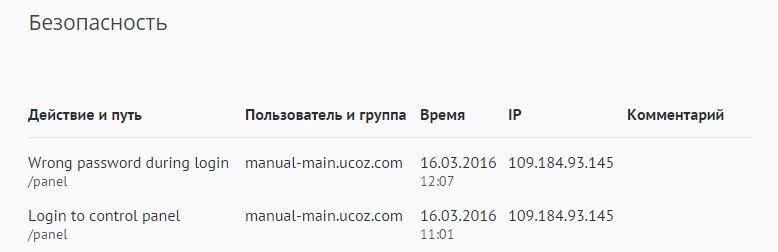 Лог безопасности отображает информацию о входе в панель управления сайтом.