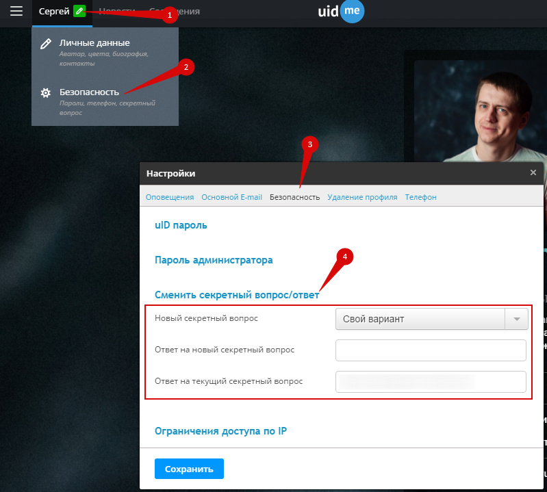 Чтобы изменить секретный вопрос и ответ, войдите в uID-аккаунт на сайте http://uid.me и откройте настройки безопасности: