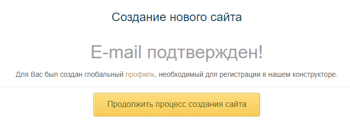 Выполнив все действия, указанные выше, вы попадете на страницу с текстом «E-mail подтвержден!». Здесь вам необходимо ввести ваш номер мобильного телефона и задать секретный вопрос для безопасной работы с сайтом (например, сайт или модуль нельзя будет впоследствии удалить, не ответив на секретный вопрос). Также вам нужно придумать ещё один пароль: он будет использоваться для входа в панель администратора на нашем будущем сайте. Пароль, придуманный нами чуть ранее, относился к uID профилю.