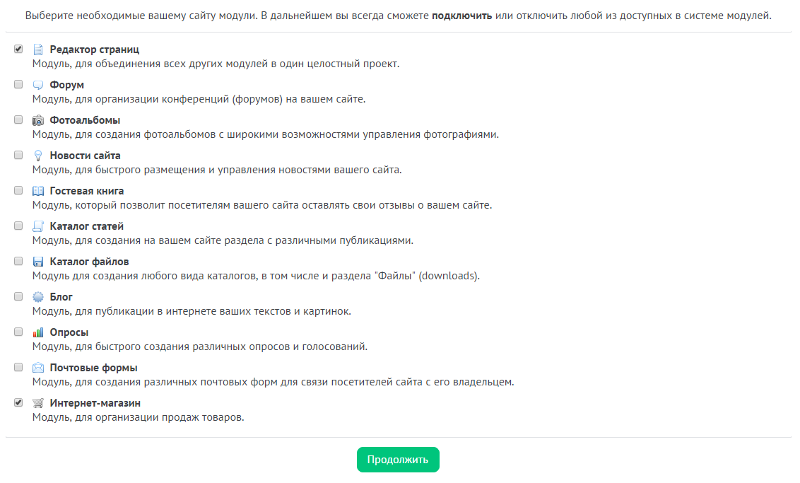 Далее перед вами появится страница с выбором модулей, которые вы хотите использовать на сайте. Нужно поставить галочки напротив тех модулей, которые вам необходимы. Если вы не уверены в том, какой именно модуль вам нужен, посмотрите инструкцию по выбору модулей или нажмите «Продолжить». После создания сайта вы сможете отключить или добавить на сайт любой модуль системы uWeb.