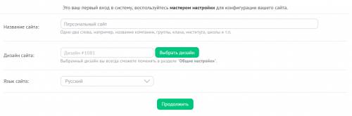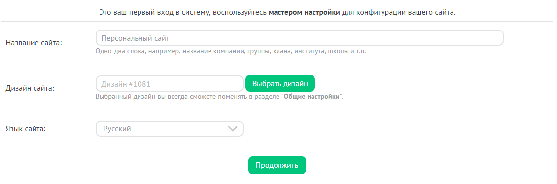 Укажите название сайта, выберите его дизайн и язык. Если вы сомневаетесь в выборе, нажмите на кнопку «Продолжить», позднее вы сможете изменить эти настройки в любой момент.