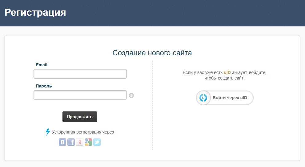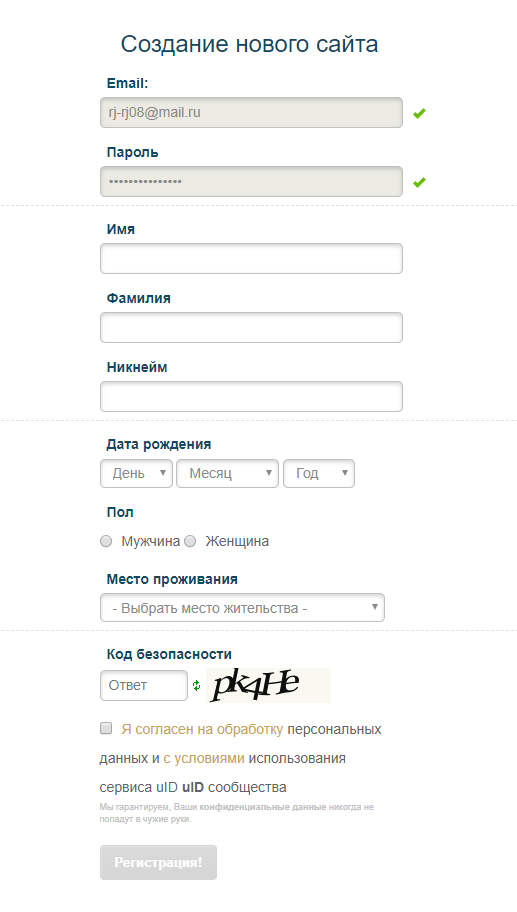 После того, как введен действующий адрес e-mail и придуман сложный пароль (или вы авторизовались с помощью социальных сетей), нажимаем на кнопку «Продолжить» и попадаем на страницу под названием «Создание нового сайта». Заполняем все пустые поля и, ставя внизу галочку, соглашаемся с условиями использования uID сообщества. Нажимаем на кнопку «Регистрация».