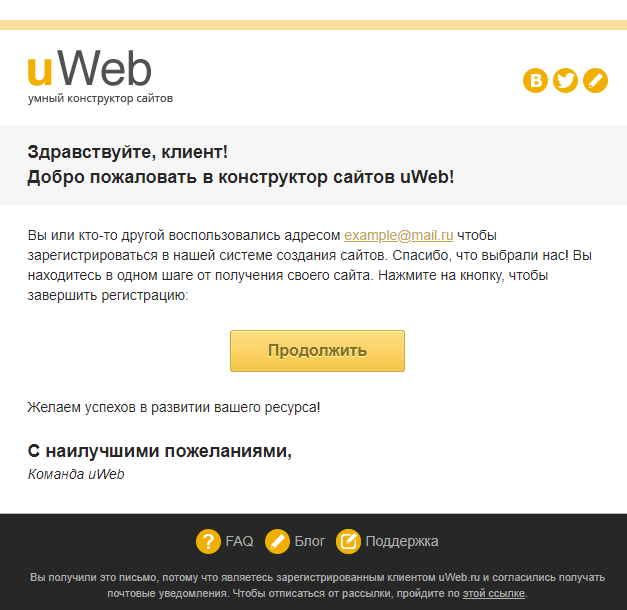 Найдите письмо с темой «uWeb - Добро пожаловать в наше сообщество!». Обратите внимание, что, в редких случаях, оно может попасть в папку «Спам». В полученном письме необходимо кликнуть на кнопку «Продолжить».