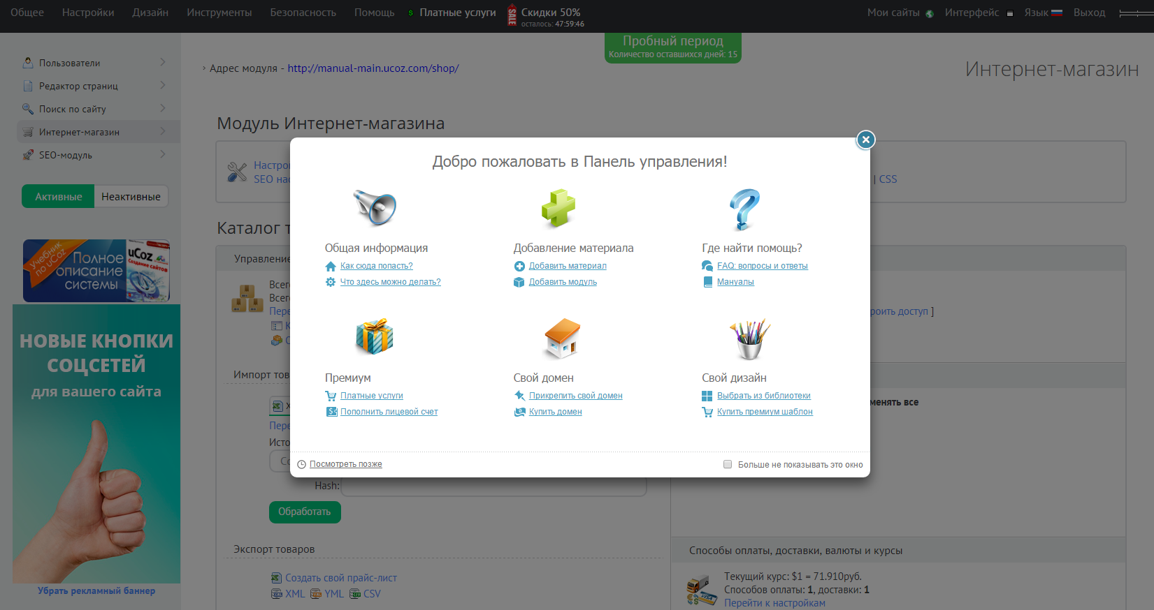 - Адрес сайта и ссылка для входа в панель управления (http://ваш_сайт/admin)