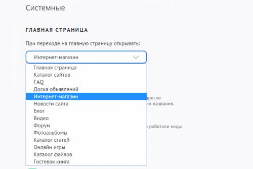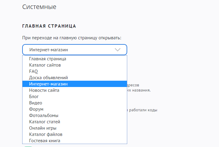 Настройка позволяет задать, главная страница какого модуля будет открываться при переходе на главную страницу сайта. В качестве такой страницы может выступать главная страница любого подключенного модуля или специально созданная «Главная страница».