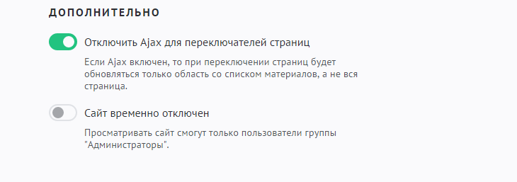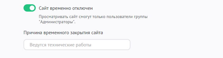 Сайт временно отключен. При включении данной опции сайт закрывается полностью, и войти на него могут только пользователи из группы «Администраторы». После установки этой опции появится поле для указания причины закрытия сайта. Введенная причина будет отображаться на главной странице вместе с формой входа для администраторов.