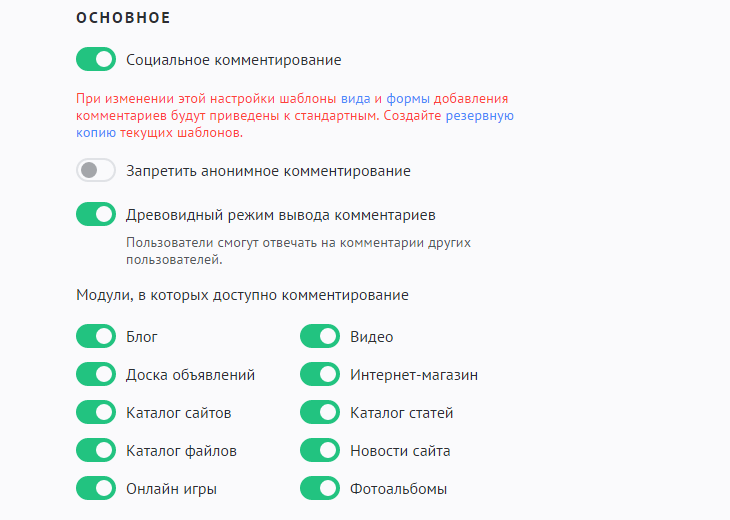 Модули, в которых доступно комментирование. Позволяет отключить возможность комментирования в определенных модулях.