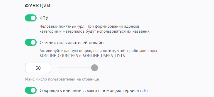 ЧПУ (человеко-понятный урл или HGU). При включении этой опции в адресе материала или категории будет добавляться транслитерированное название. Это позволит догадаться о содержимом страницы, не переходя на нее. Кроме того, это положительно скажется на индексации поисковыми системами.