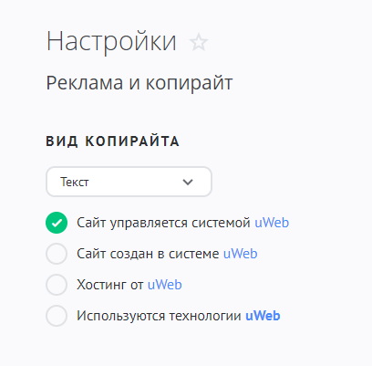 Данный раздел позволяет настроить вид копирайта, который отображается на сайтах на ряде тарифных планов.