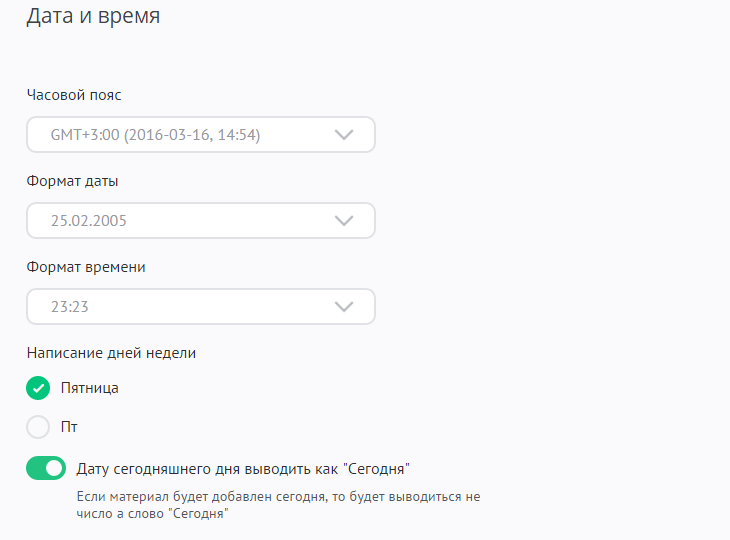 В этом разделе находятся настройки времени, которое будет отображаться на вашем сайте. Это время будет использоваться для определения даты добавления или редактирования материалов.