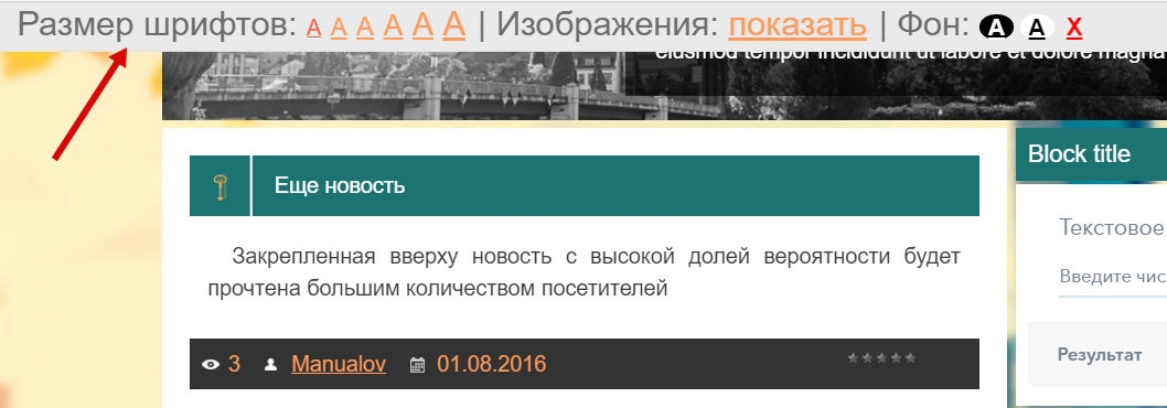 Панель управления версией сайта для слабовидящих выглядит следующим образом:
