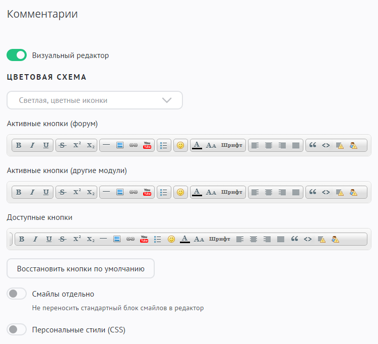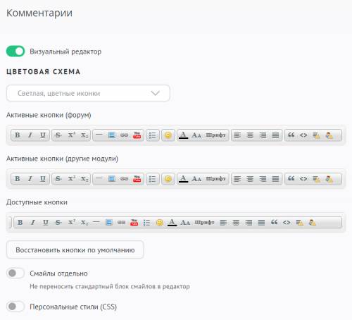Путем перетаскивания кнопок с панели «Активные» в «Доступные» и обратно можно добиться желаемого внешнего вида формы добавления комментариев.