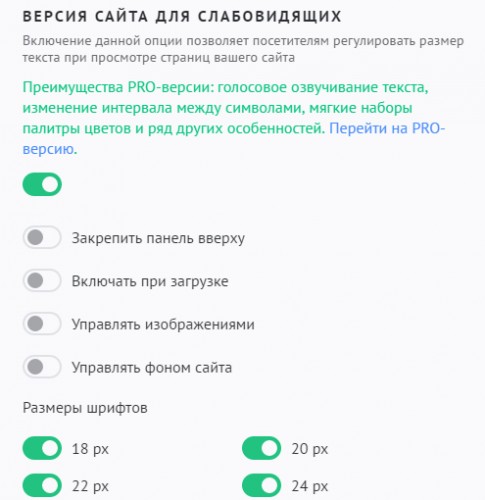Включение данной опции позволяет посетителям регулировать размер текста при просмотре страниц вашего сайта. Также вы можете изменить следующие настройки: