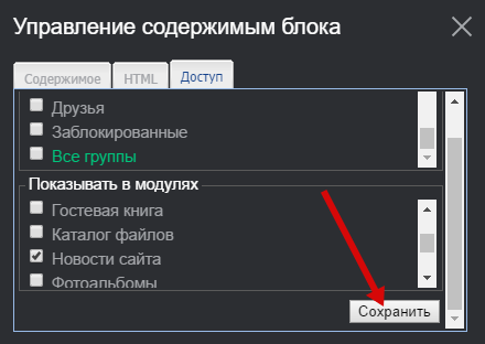 - Доступ. С помощью данного раздела можно настроить гибкий показ блока в различных модулях сайта и различным группам пользователей. Например, вы добавили информер последних новостей и хотите, чтобы они отображались только в модуле «Новости» и только для обычных пользователей.