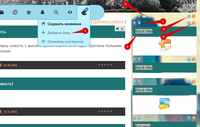 Теперь вы можете управлять блоками и их содержимым. В любой момент вы можете выключить конструктор, выбрав будут ли сохранены внесенные изменения.
