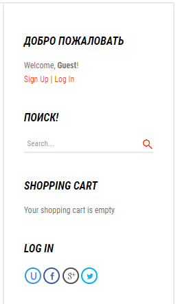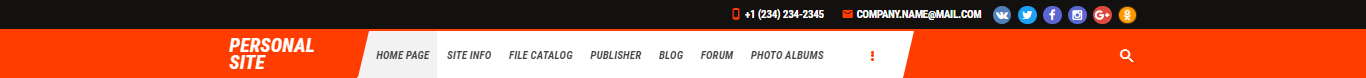 Верхняя часть шаблона состоит из социальных иконок, ссылок на страницы авторизации/регистрации, названия сайта, пунктов меню и формы поиска.