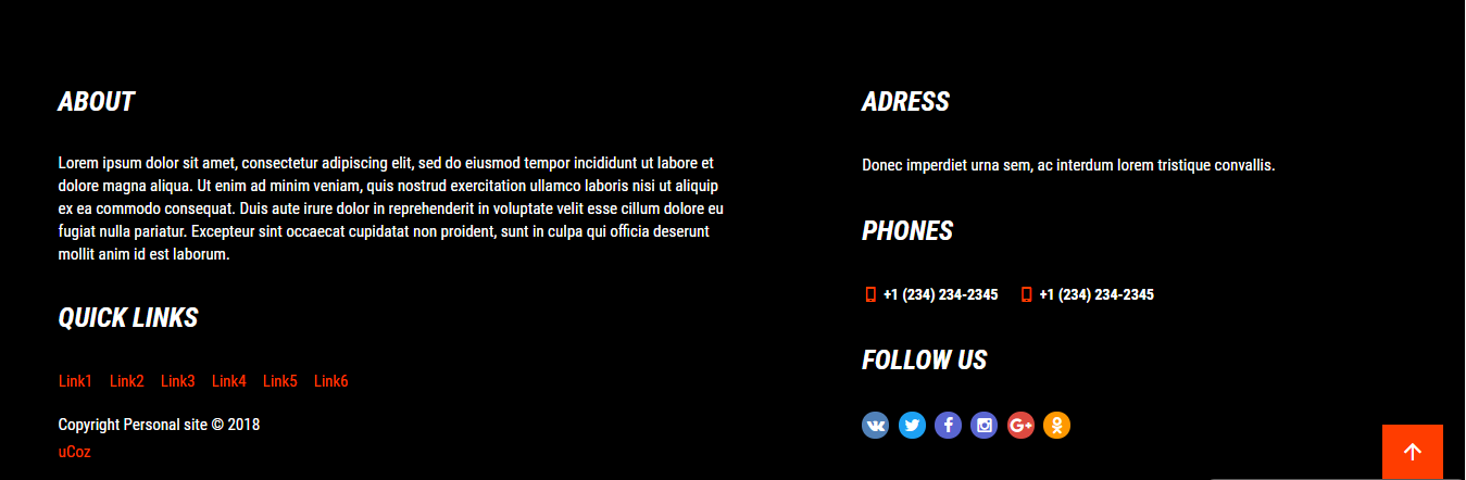 <div class="adress"> <h3>Adress</h3> <p>Donec imperdiet urna sem, ac interdum lorem tristique convallis.</p> </div> <div class="contacts"> <h3>Phones</h3> <span class="phone"><span>+1 (234) 234-2345</span></span> <span class="phone"><span>+1 (234) 234-2345</span></span> </div> <div class="soc-block"> <h3>Follow us</h3> <span><a href="https://vk.com" target="_blank" class="fa fa-vk"></a></span> <span><a href="https://twitter.com" target="_blank" class="fa fa-twitter"></a></span> <span><a href="https://facebook.com" target="_blank" class="fa fa-facebook"></a></span> <span><a href="https://instagram.com" target="_blank" class="fa fa-instagram"></a></span> <span><a href="https://plus.google.com" target="_blank" class="fa fa-google-plus"></a></span> <span><a href="https://ok.ru/" target="_blank" class="fa fa-odnoklassniki"></a></span> </div> </div>