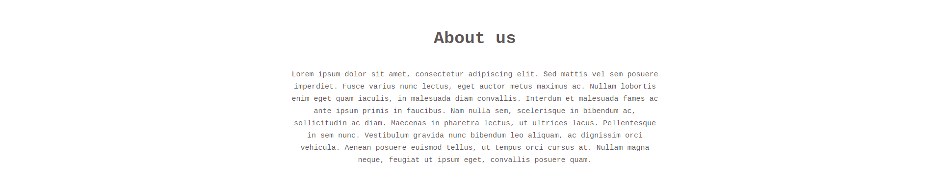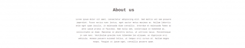 <h3 class="title">About us</h3> <p>Lorem ipsum dolor sit amet, consectetur adipiscing elit. Sed mattis vel sem posuere imperdiet. Fusce varius nunc lectus, eget auctor metus maximus ac. Nullam lobortis enim eget quam iaculis, in malesuada diam convallis. Interdum et malesuada fames ac ante ipsum primis in faucibus. Nam nulla sem, scelerisque in bibendum ac, sollicitudin ac diam. Maecenas in pharetra lectus, ut ultrices lacus. Pellentesque in sem nunc. Vestibulum gravida nunc bibendum leo aliquam, ac dignissim orci vehicula. Aenean posuere euismod tellus, ut tempus orci cursus at. Nullam magna neque, feugiat ut ipsum eget, convallis posuere quam.</p>