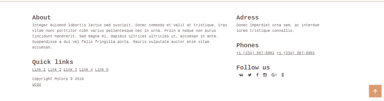 <div class="address-wrap"> <h6>Adress</h6> <p>Donec imperdiet urna sem, ac interdum lorem tristique convallis.</p> </div> <div class="phones-wrap"> <h6>Phones</h6> <a href="#">+1 (234) 567-8901</a> <a href="#">+1 (234) 567-8901</a> </div> <div class="soc-wrap"> <h6>Follow us</h6> <div class="soc-block"> <span><a href="https://vk.com" target="_blank" class="fa fa-vk"></a></span> <span><a href="https://twitter.com" target="_blank" class="fa fa-twitter"></a></span> <span><a href="https://facebook.com" target="_blank" class="fa fa-facebook"></a></span> <span><a href="https://instagram.com" target="_blank" class="fa fa-instagram"></a></span> <span><a href="https://plus.google.com" target="_blank" class="fa fa-google-plus"></a></span> <span><a href="https://ok.ru/" target="_blank" class="fa fa-odnoklassniki"></a></span> </div> </div>