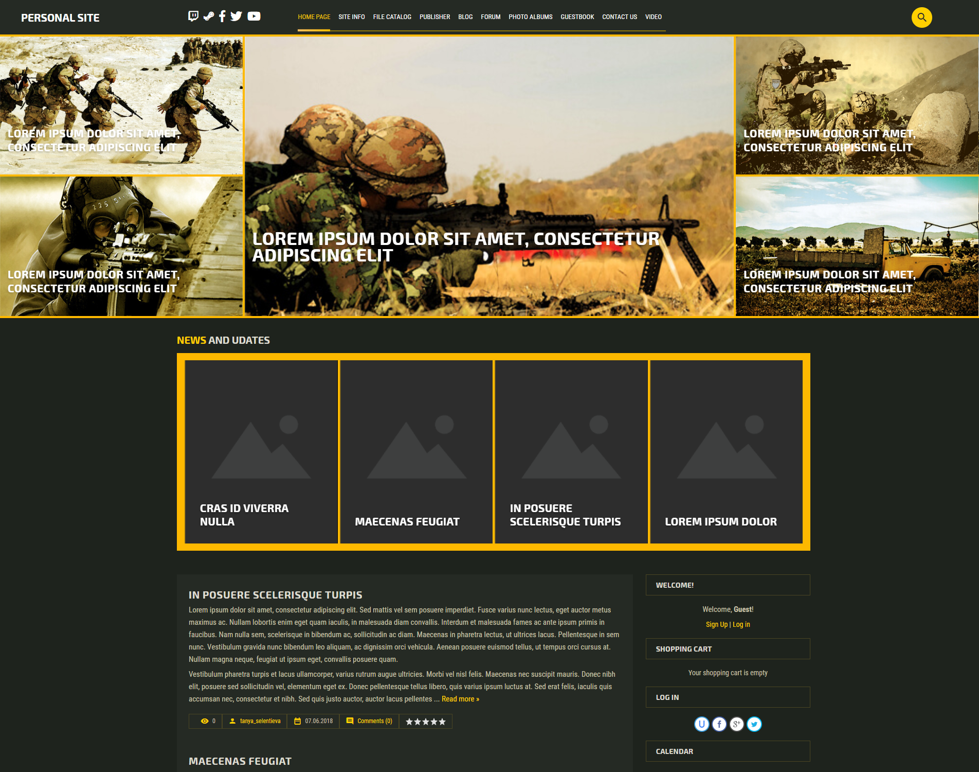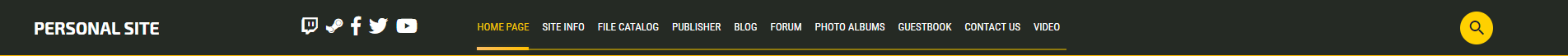 Верхняя часть шаблона состоит из надписи названия сайта, иконок социальных сетей, пунктов меню и строки поиска.