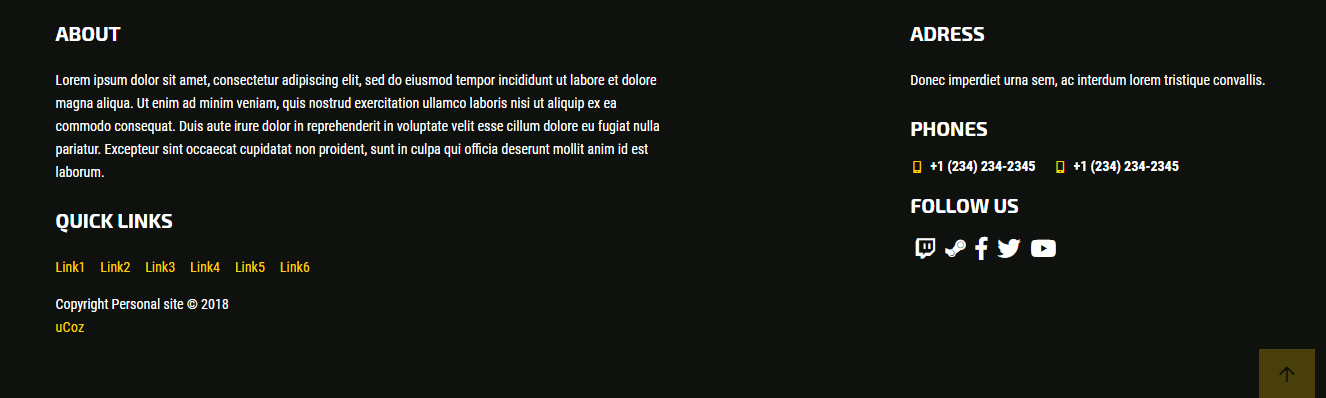 <div class="adress"> <h3>Adress</h3> <p>Donec imperdiet urna sem, ac interdum lorem tristique convallis.</p> </div> <div class="contacts"> <h3>Phones</h3> <span class="phone"><span>+1 (234) 234-2345</span></span> <span class="phone"><span>+1 (234) 234-2345</span></span> </div> <div class="soc-block"> <h3>Follow us</h3> <ul class="soc-block"> <li><a class="fab fa-twitch" href="#"></a></li> <li><a class="fab fa-steam-symbol" href="#"></a></li> <li><a class="fab fa-facebook-f" href="#"></a></li> <li><a class="fab fa-twitter" href="#"></a></li> <li><a class="fab fa-youtube" href="#"></a></li> </ul> </div>
