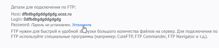 На созданном сайте пароль FTP по умолчанию не установлен. Для установки пароля нажмите на ссылку “Установить”. Откроется страница замены пароля FTP.