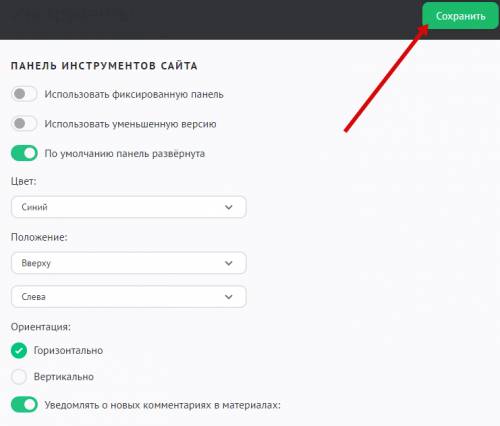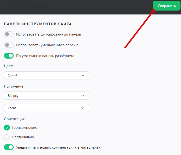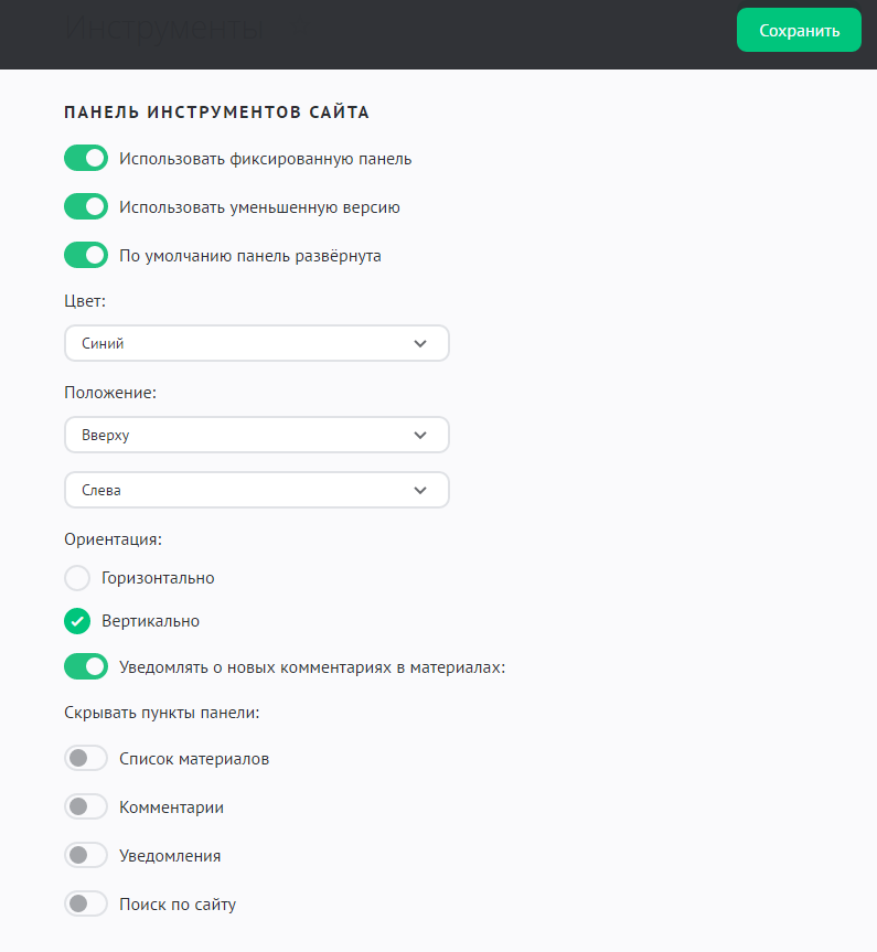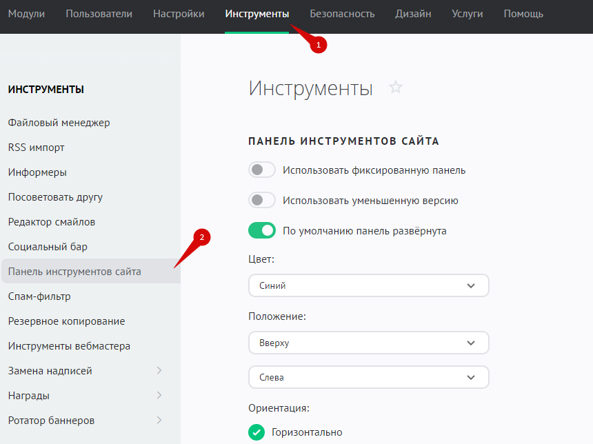 Чтобы настроить внешний вид и расположение панели инструментов, в панели управления сайтом откройте раздел «Инструменты» и выберите в меню слева «Панель инструментов сайта»: