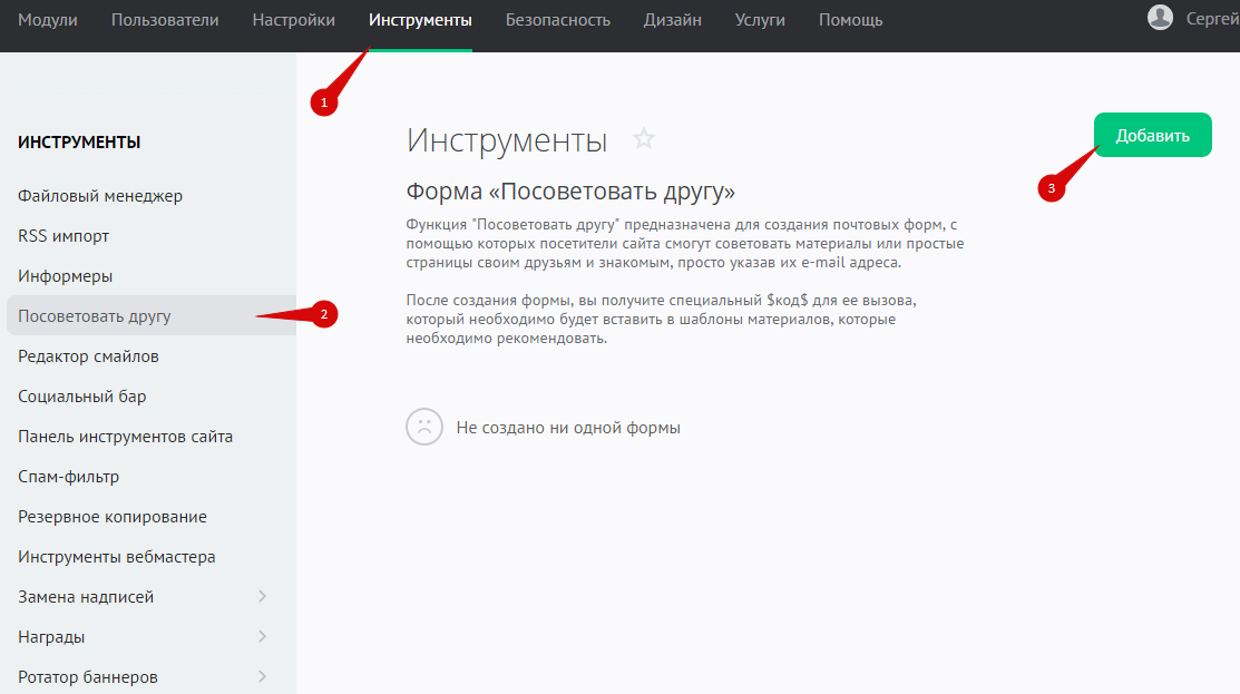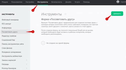 Перейдите в раздел «Инструменты» (1), в меню слева выберите «Посоветовать другу» (2) и нажмите на кнопку «Добавить» (3):