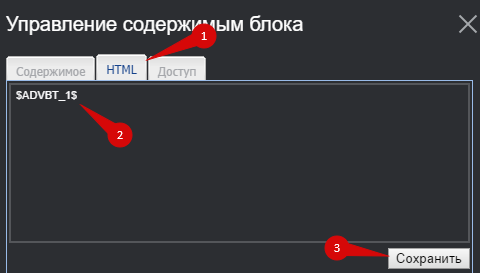 Перейдите на вкладку HTML (1) и вставьте скопированный ранее код (2). Нажмите на кнопку «Сохранить» (3):