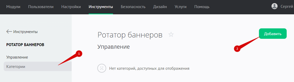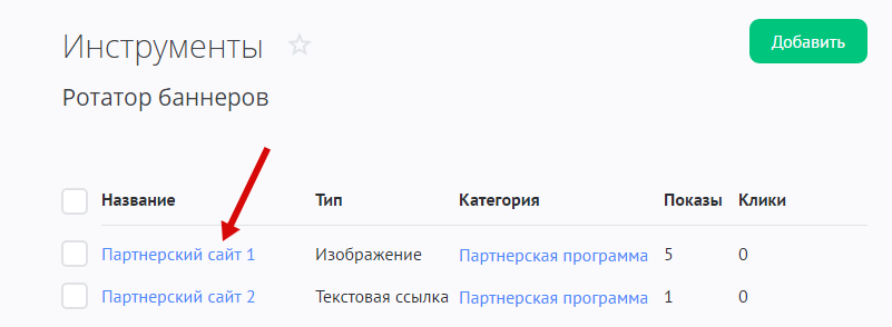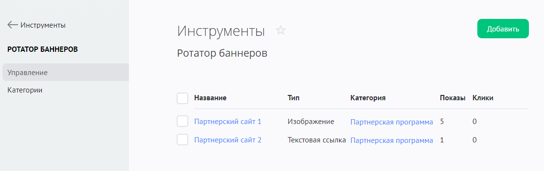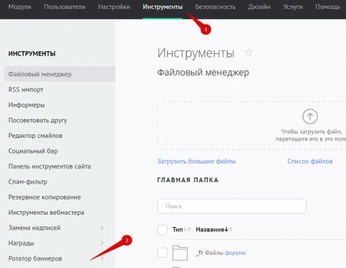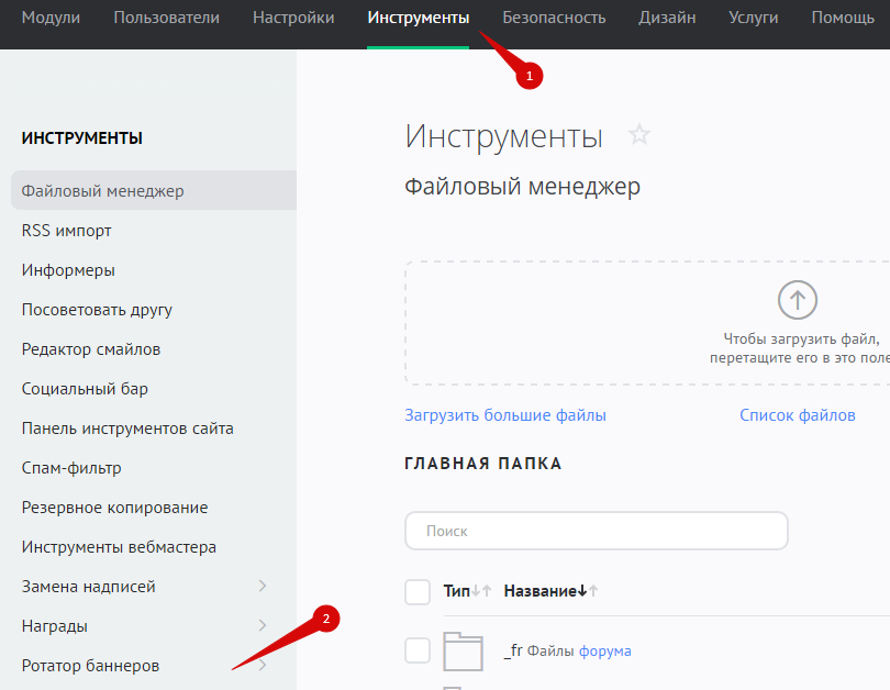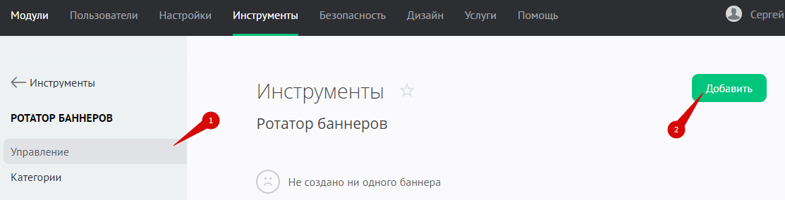 Чтобы перейти к настройкам ротаторов баннеров, в панели управления зайдите в раздел «Инструменты» и в меню слева выберите «Ротатор баннеров»: