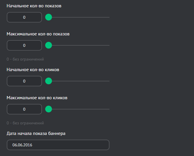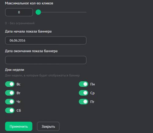 • Максимальное количество показов — при достижении указанного количества просмотров баннер будет выключен (0 — без ограничений)