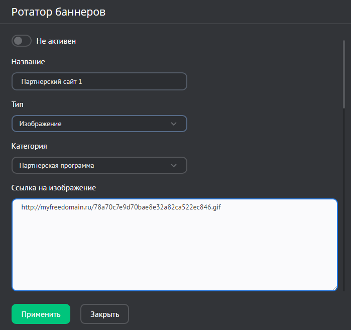 • Не активен — активируйте опцию, чтобы не запускать показ баннера сразу после добавления