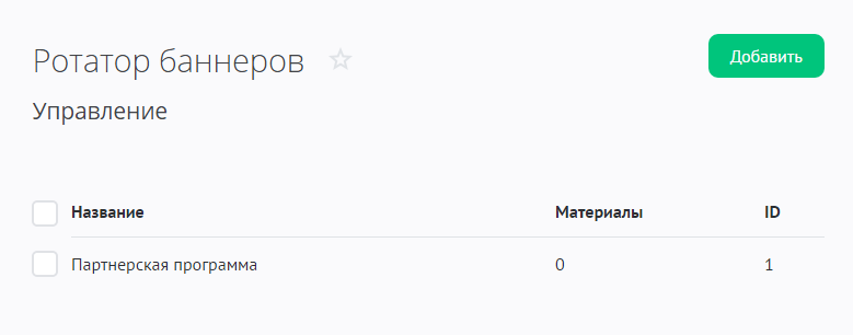 Чтобы добавить баннер, из меню слева выберите пункт «Управление» и нажмите на кнопку «Добавить»: