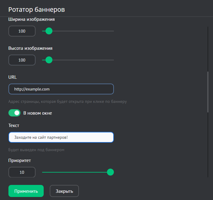 • Приоритет — чем выше значение, тем чаще будет показываться баннер