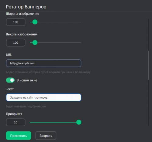 • Максимальное количество кликов — при достижении указанного количества кликов баннер будет выключен (0 — без ограничений)