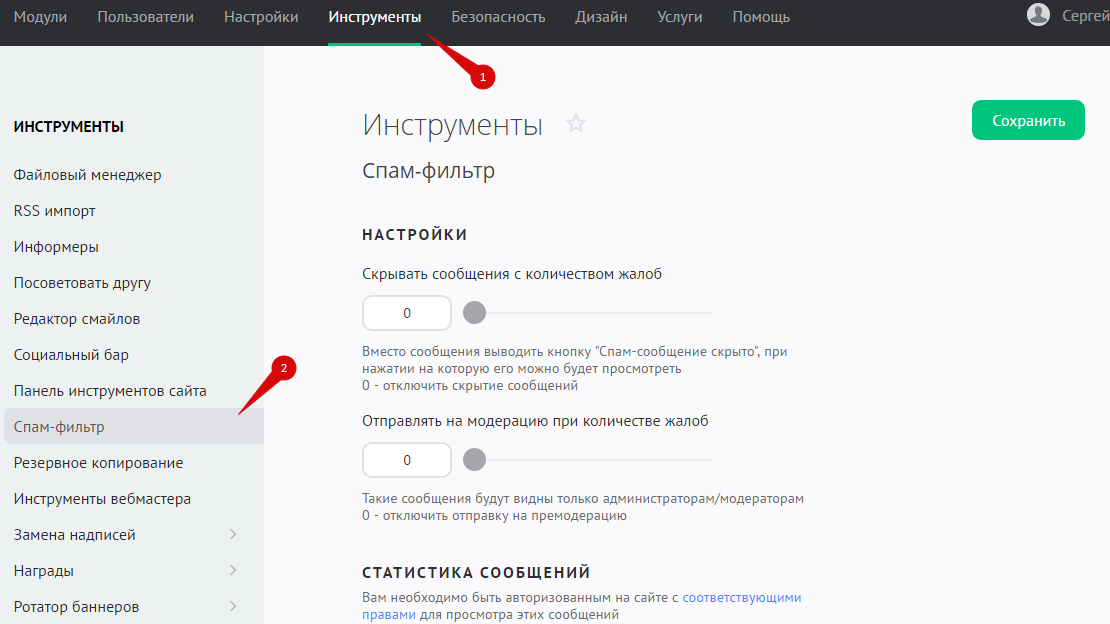 Чтобы перейти к настройке спам-фильтра, в панели управления сайтом откройте раздел инструменты и выберите в меню слева пункт «Спам-фильтр»:
