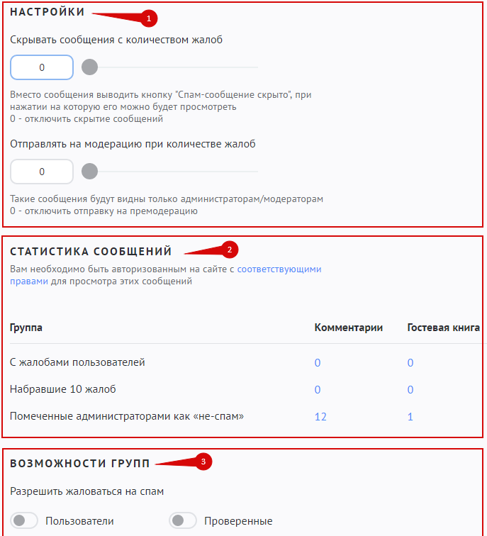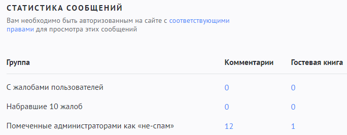 В данном разделе представлена статистика по опубликованным сообщениям. Числа в таблице являются ссылками, нажав на них можно перейти к просмотру сообщений раздела. Чтобы управлять комментариями, необходимо авторизоваться на сайте как администратор и иметь право «Разрешить управление спам-статусом сообщений (возможность запрещать жаловаться на определенные сообщения)», которое включается в разделе «Возможности групп».
