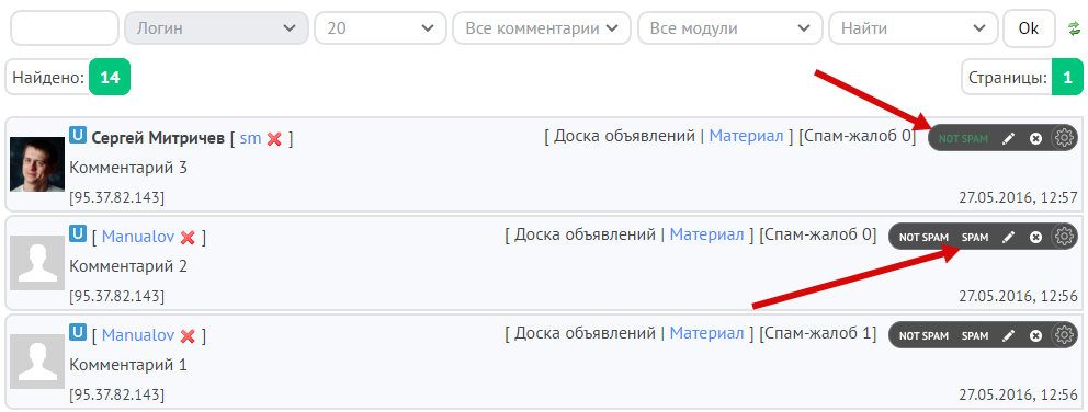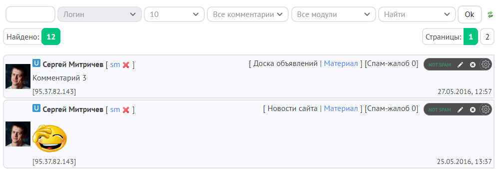 Так выглядит страница управления комментариями:
