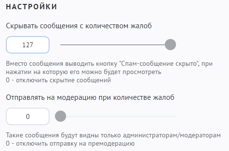 - Отправлять на модерацию при количестве жалоб — такие сообщения будут видны только администраторам/модераторам. Укажите количество жалоб, по достижению которого сообщение будет скрыто. Допустимые значения от 0 до 127 (0 — отключить отправку на премодерацию).