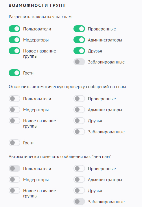 - Разрешить жаловаться на спам — определяет, каким именно группам будет доступна возможность пометить сообщение как спам