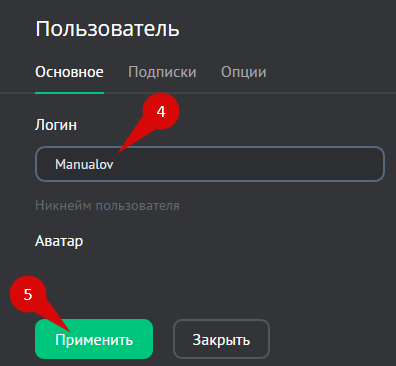 В списке пользователей (1) отметьте пользователя галочкой (2) и нажмите на кнопку «Изменить» (3). В открывшемся окне укажите новый логин пользователя (4) и нажмите на кнопку «Применить» (5).