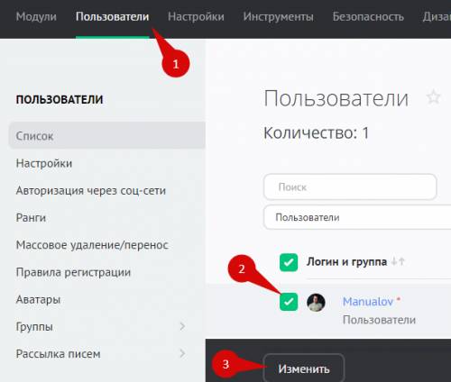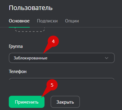 Для этого перейдите в раздел списка пользователей: Панель управления — Пользователи. В списке пользователей (1) отметьте пользователя галочкой (2) и нажмите на кнопку «Изменить» (3). В открывшемся окне укажите группу «Заблокированные» (4) и нажмите на кнопку «Применить» (5).